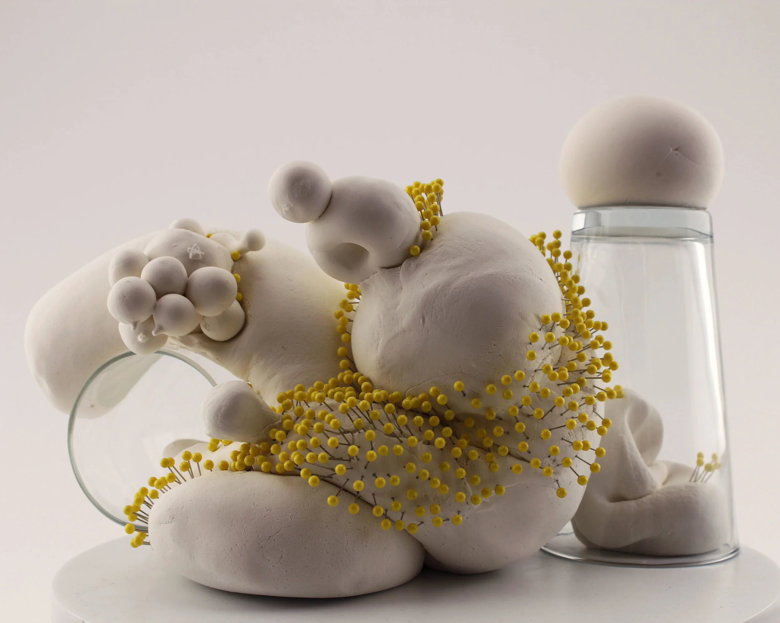 self growth, 2019 digestive and salival bacterial growth on 3D printed sculptures, photographed with food and alcohol